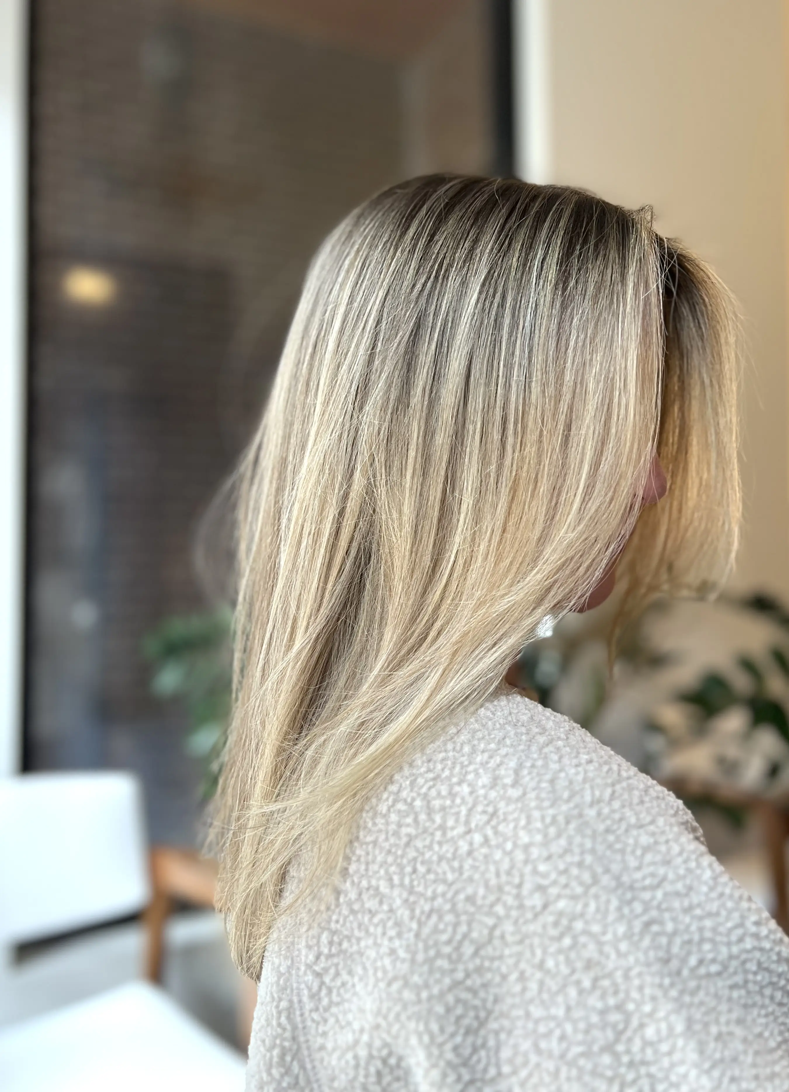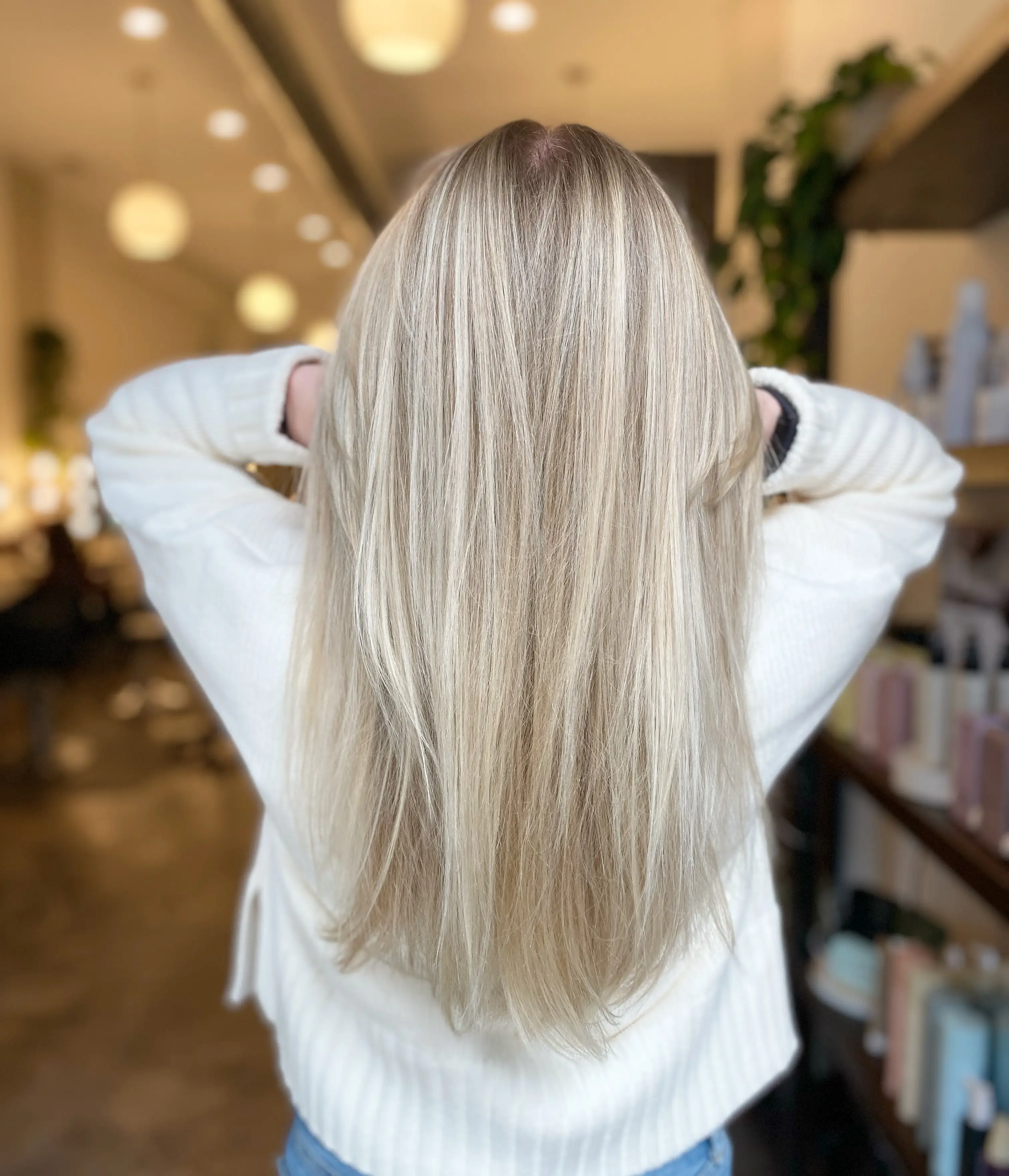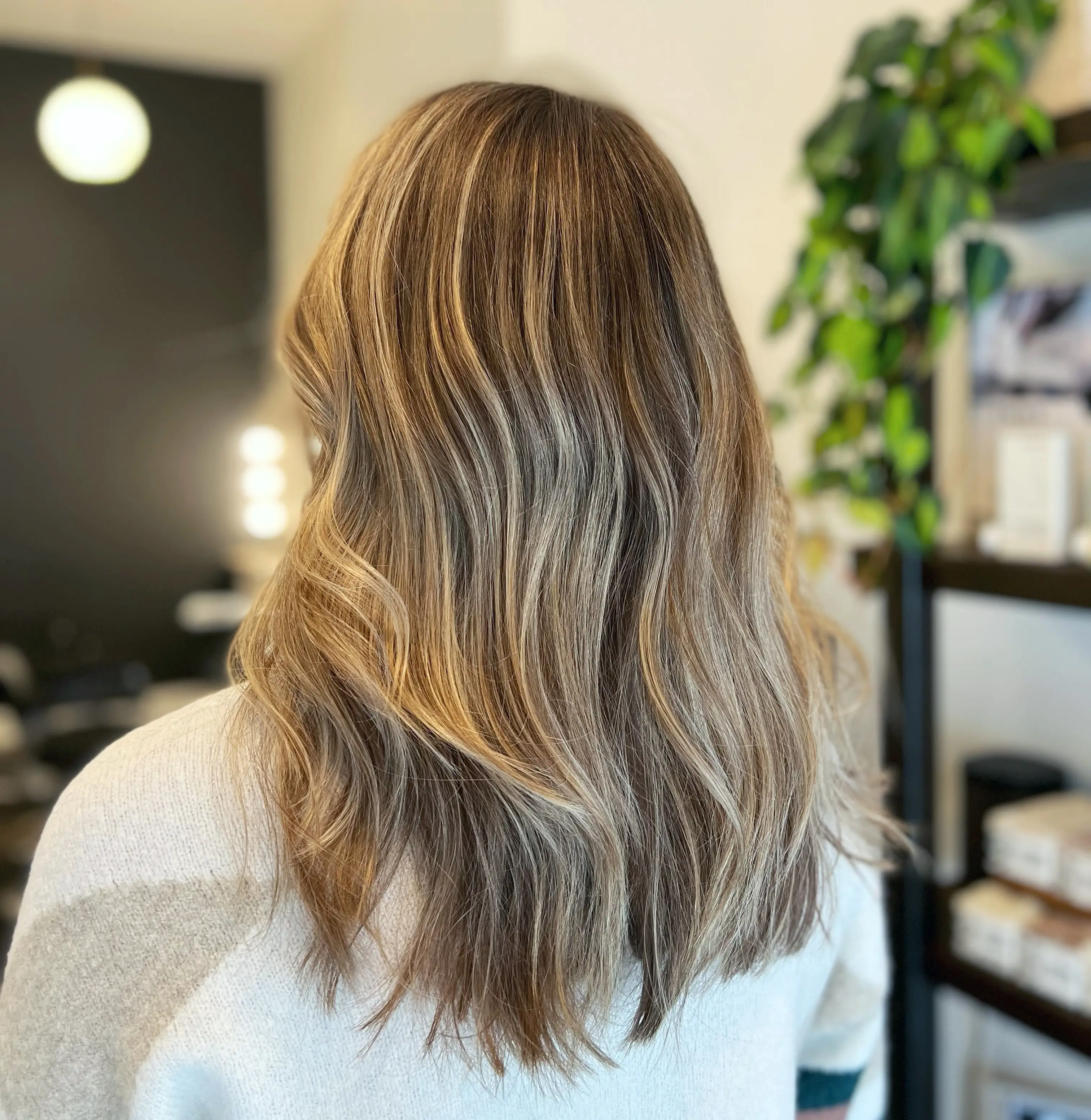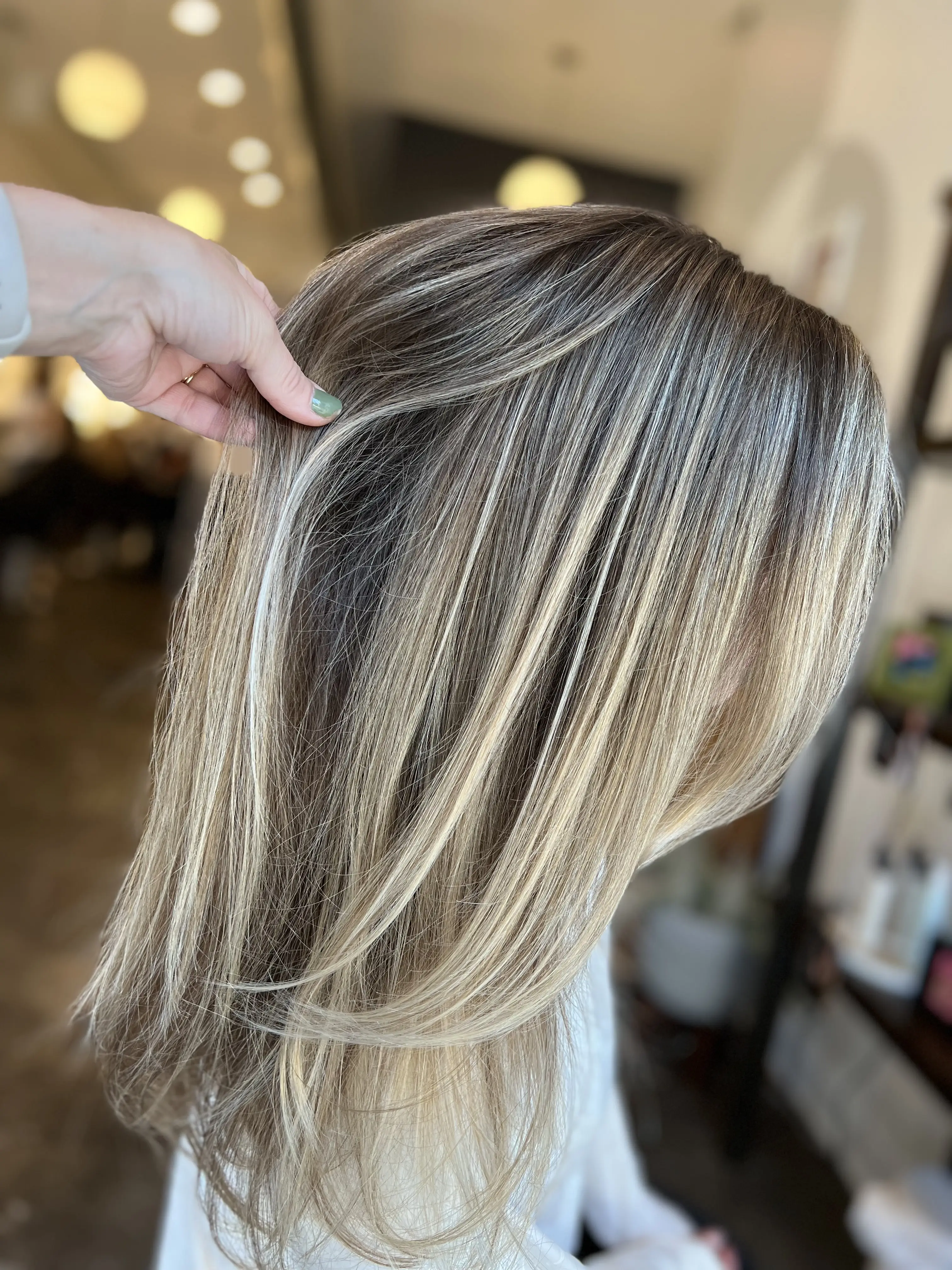 This is for clients needing routine maintenance of a partial highlight service designed to add brightness and dimension from roots to ends. Includes a personalized consultation, custom foil placement, toning, and a blowout. *For a more lived in look, please book a custom blonding service in the Lived In category